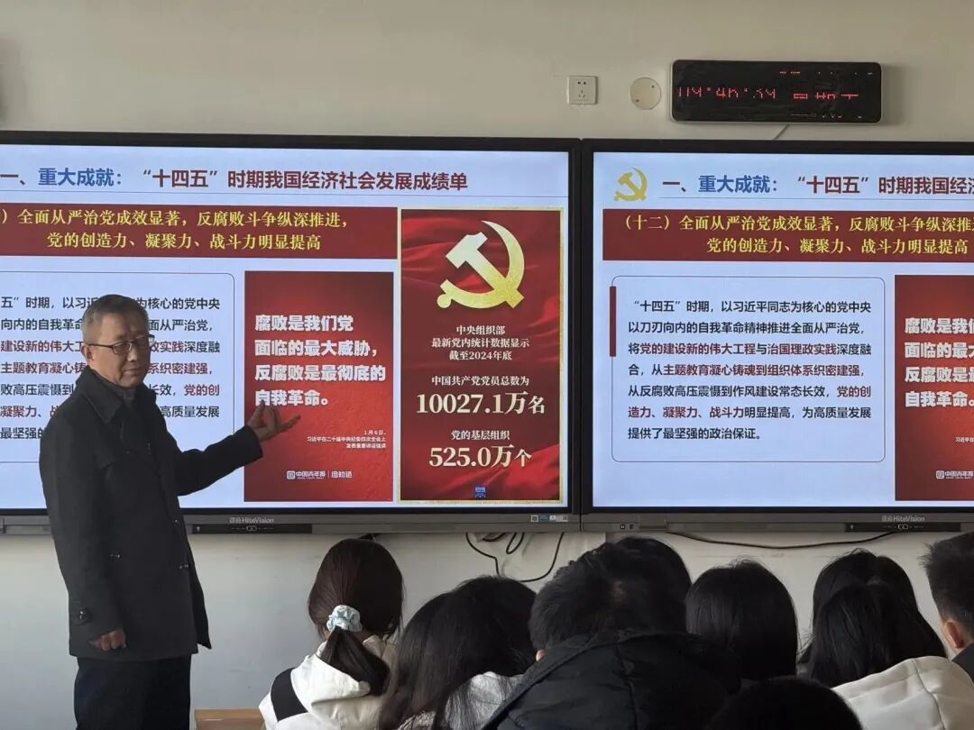 马老师首先从经济运行稳中有进、高质量发展扎实推进等十二个方面展开讲解,带领同学们学习了党的二十届四中全会总结的“十四五”时期我国经济社会发展重大成就。报告还从历史、理论、实践和国际四个维度,深入阐释了全会的重大意义。最后聚焦新时代青年的使命担当,激励全体学员珍惜时代机遇,把个人兴趣与优势同国家发展需要紧密结合,在传承创新、实干奋斗中释放青春能量。